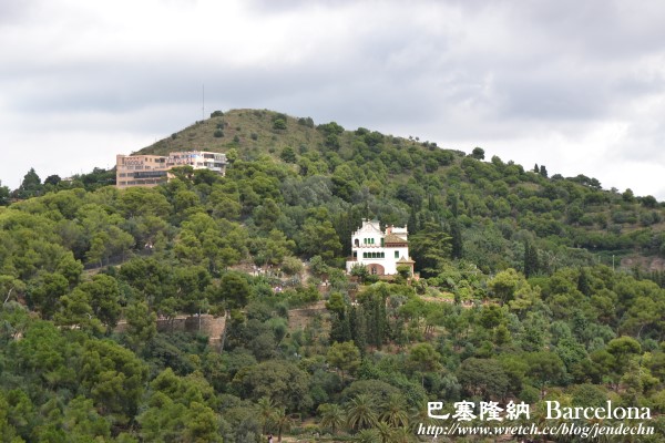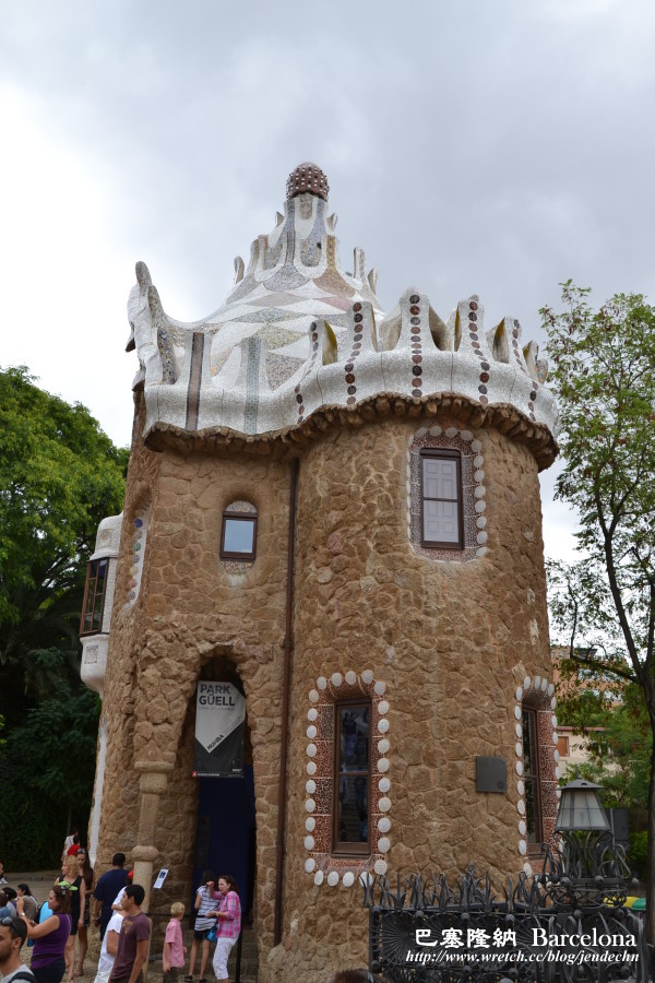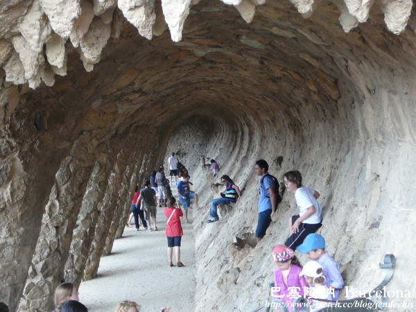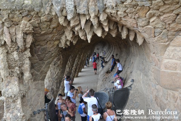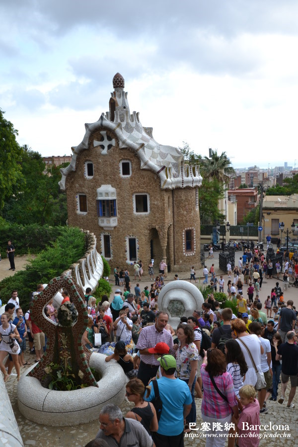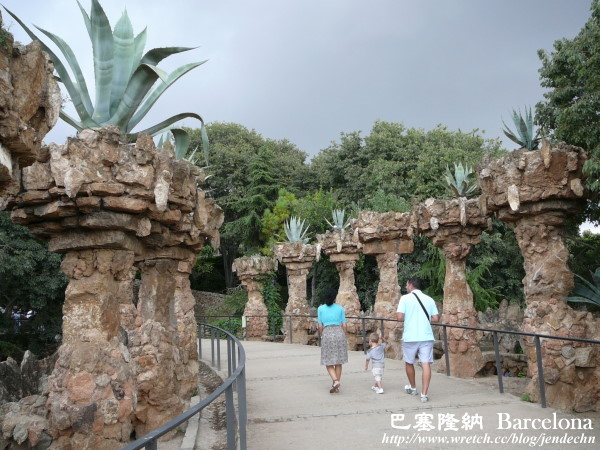我們參觀桂爾公園當天,恰逢週六,24號公車上擠滿了遊客,公車沿著蜿蜒山路往上爬,路況不熟的我們,本來還擔心會錯過下車站牌,到了Parc Güell站時,車上幾乎所有的人都下車了,跟著大夥走,很快就找到桂爾公園的側門。由側門處繞著S型步道往上走,地勢越爬越高,可以俯瞰下面的廣場,甚至俯瞰更遠處的巴塞隆納市區,視野很好。大部分的遊客都集中在廣場大門附近,後山步道遊客不多,格外顯得幽靜,走在其中,十分愜意,只可惜天候不佳,灰灰濛濛,天邊烏雲飄來,少了藍天。