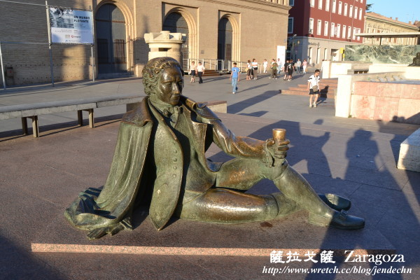 比拉爾聖母院前面的比拉爾廣場(Plaza de Pilar)連結東邊的拉塞歐廣場(Plaza de la Seo),形成了一個長500公尺的大廣場,兩旁咖啡座不少,聚集了不少遊客。廣場的西端正對著高聳的斯達之塔(Torreón de la Zuda),東邊則正對著大教堂(La Seo),相對於壯觀的比拉爾聖母院,這個大教堂就顯得不是那般醒目。廣場西側有座大型的人造石山瀑布,東側則有著美麗的雕塑藝術,那幾座坐姿雕像最有趣,其中以畫家哥雅的雕像最熱門(哥雅的出生地在薩拉戈薩附近),遊客們一個個搶著與哥雅的雕像拍照,我們當然也要來湊湊熱鬧。