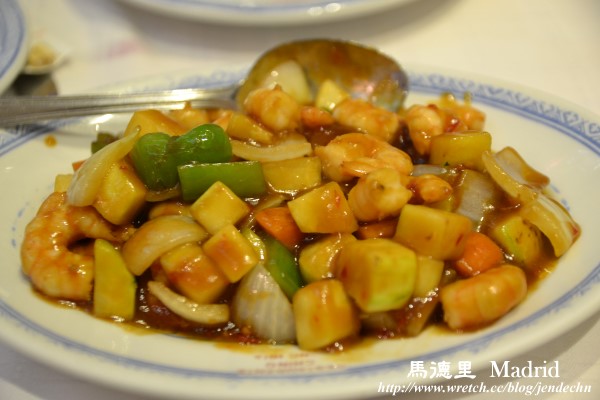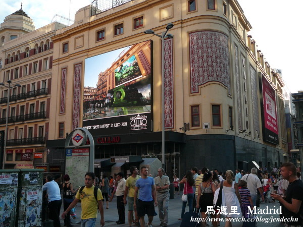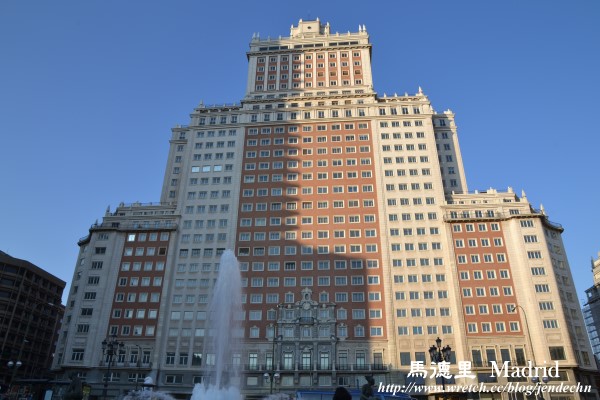 由王宮往Calle de Balén的反方向走,可以到達西班牙廣場,西班牙廣場內有好幾座噴水池,高立在廣場中央的白色紀念碑上,坐著的是「唐吉珂德傳」的作者-賽萬提斯雕像,賽萬提斯雕像的前方是騎著馬的唐吉珂德和隨從桑丘的胖瘦二人組銅像,由水池往紀念碑方向看,聳立在廣場背後的龐大建築物是西班牙大樓。由西班牙廣場沿著古藍維亞大道(Gran Vin)走到Callao廣場,古藍維亞大道上聚集不少商店,遊客人潮絡繹不絕,我們在Callao廣場附近找到一家中國餐廳,價錢實在又美味,此行的最後兩個晚餐,就在這裡解決。