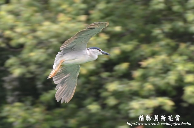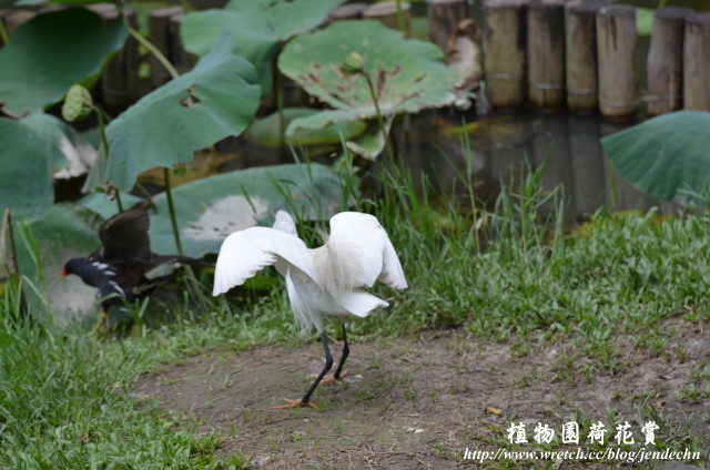 第一天鏡頭正對著荷花池時,突然瞄到夜鷺飛越荷花池,來不及調成高速快門,竟然也能抓到不錯的畫面。隔天看到兩場紅冠水雞與白鷺鷥打鬥的場面,第一場紅冠水雞退回到荷花池。第二場讓現場的觀眾,都覺得驚訝萬分,紅冠水雞直接衝上來攻擊白鷺鷥,白鷺鷥向後退個幾步,落荒而逃!因為現場還有幾隻紅冠水雞的幼鳥在,而且幼鳥一直發出啾‧‧‧啾‧‧‧的聲音,似乎期待母親能多給它們一點食物,也許是「婦人弱也,為母則強」激發了紅冠水雞的戰鬥意志吧!