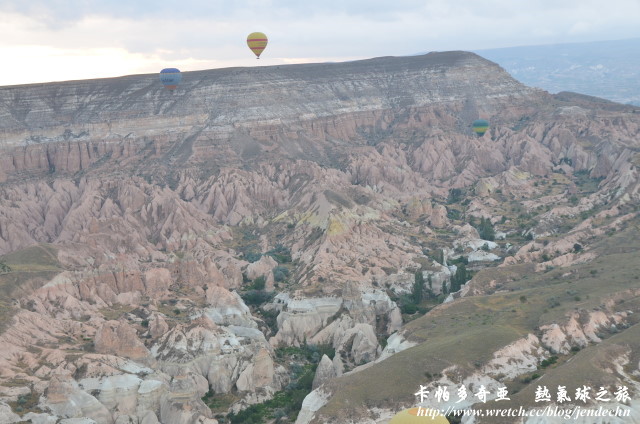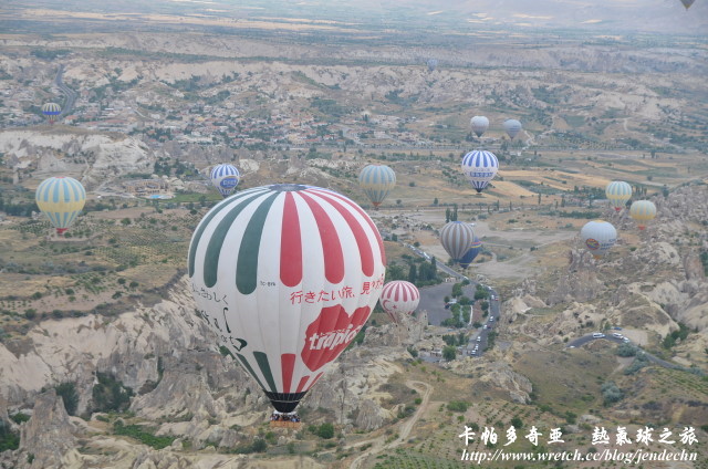 帶著既期待又興奮的心,跟著熱氣球冉冉升空,越飛越高, Gőreme市區的房屋逐漸縮小,視野逐漸擴大,詢問駕駛飛行的高度,他說最高高度一千多公尺。熱氣球由Gőreme往玫瑰谷方向飄去,我們昨天開過的景點都在腳下,駕駛還特地將熱氣球停在玫瑰谷前,讓大家看清楚自然界那鬼斧神工的精細雕琢,卡帕多奇亞特殊的地形一網打盡,壯觀的奇岩巨石看得我們目瞪口呆,每個人的相機都拍個不停,只可惜這天早上雲層稍厚些,天空不夠湛藍,否則滿空色彩豔麗的熱氣球會更加繽紛。