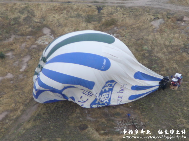 卡帕多奇亞繞了一圈後,熱氣球逐漸下降,下降的過程需要良好的技術,風向地形都須確實掌握,我們在空中看到了三、四個著地時傾斜一側的熱氣球,還看到一個卡住在峽谷中,隔天遇到的一群台灣人也說他們的熱氣球卡在狹縫中,等待一個小時,救援車隊才到。我們的英國駕駛看來很有經驗,也很沉穩,提醒大家著地時必須蹲下,背對飛行的方向拉緊固定在籃子上的繩子,落地那瞬間的撞擊力道果然很強,喀~喀~喀三聲後,熱氣球平穩的落地,全部的人都興奮的拍手叫好。