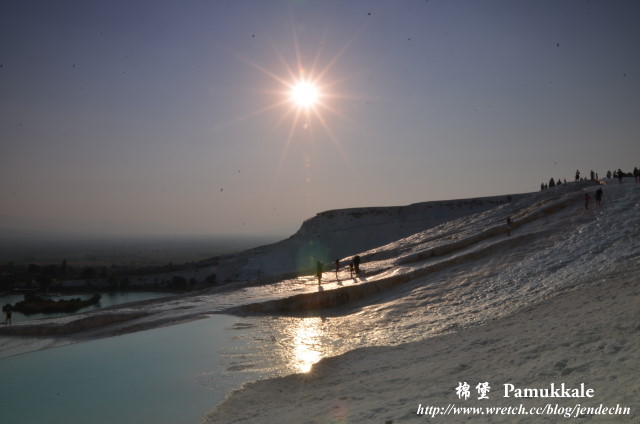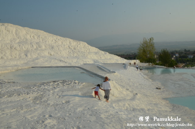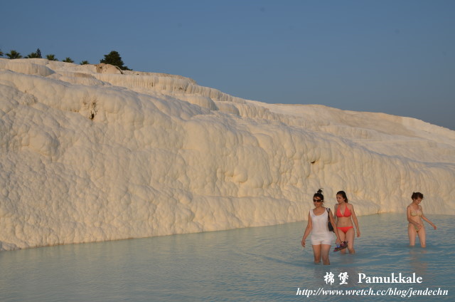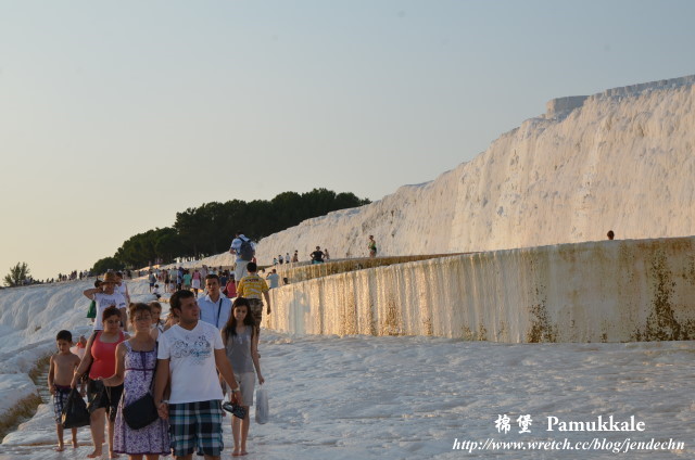 到棉堡村的Beyaz Kale Hotel入住後,並不急著參觀石灰棚(Travertines),這裡的氣溫太熱了(超過40℃ ),計畫傍晚時再進去,避開正午艷陽,順便觀賞夜景。進石灰棚有三個入口,離我們最近的是棉堡村入口,門票每人20里拉(台幣約340元),石灰棚下方有處泳池戲水區,和石灰棚是不相通的,必須另外買票。這片石灰岩層,在人為破壞下,溫泉水量逐漸枯竭,為了保護石灰棚,售票處進入後,很快會看到一張長椅,從這裡開始,必須脫鞋走在崎嶇不平的石灰岩上,赤腳走個二、三百公尺,一路上偶而會聽到哀叫聲,有些路段走來還頗刺痛的。