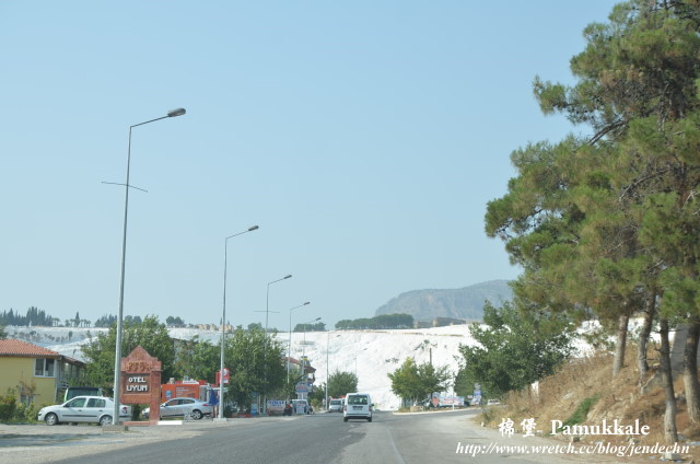 棉堡是土耳其的一級觀光景點,很少人來土耳其旅遊會錯過它,我們當然也得排入行程,但它在土耳其西半邊的內陸中心,如果地中海和愛琴海沿岸都要走,行程上就很難排。最後選擇由費提耶Fethiye進棉堡,再由棉堡開到博德魯姆Bodrum,由費提耶走D350轉入D585(E87),路況很不錯,車程比原先預估的快,一看到遠處山頭上那片白雪般的石灰棚,就知道棉堡村到了!