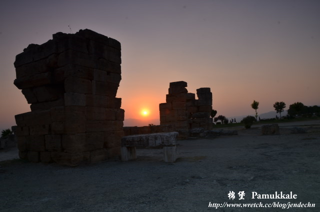 石灰棚的上方就是Hierapolis遺跡,羅馬時代起就知道這片溫泉的療效,這是西元前190年興建的城市,如今只剩下殘破的石堆,參觀Hierapolis不需再買票,要走到北門售票口附近,還需再走二、 三公里 ,我們走到圓形競技場這邊,就懶得繼續走過去,只想坐下望著夕陽沒入地平線,看那雪白石灰棚逐漸變成金黃大地,靜靜等著夜色昏暗,燈光亮起。當燈光亮起時,石灰棚在燈光下增添了一股神秘色彩,有著特別迷人的魅力,一把揹了半天的腳架拿出來,警衛馬上出現,說石灰棚不能使用腳架,即使放在木造的平台上也不能,眼睜睜看著美景,卻無法拍下,實在有點遺憾!