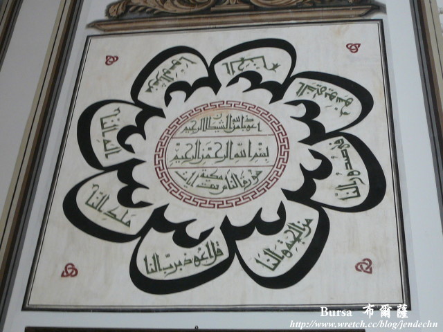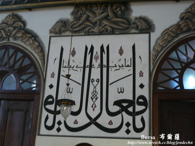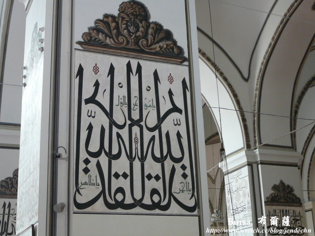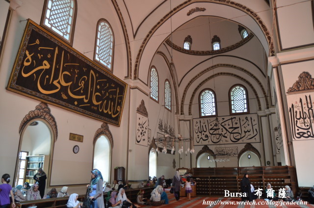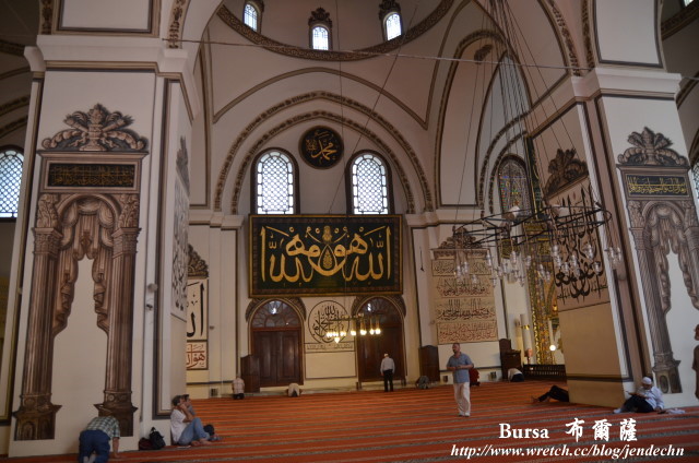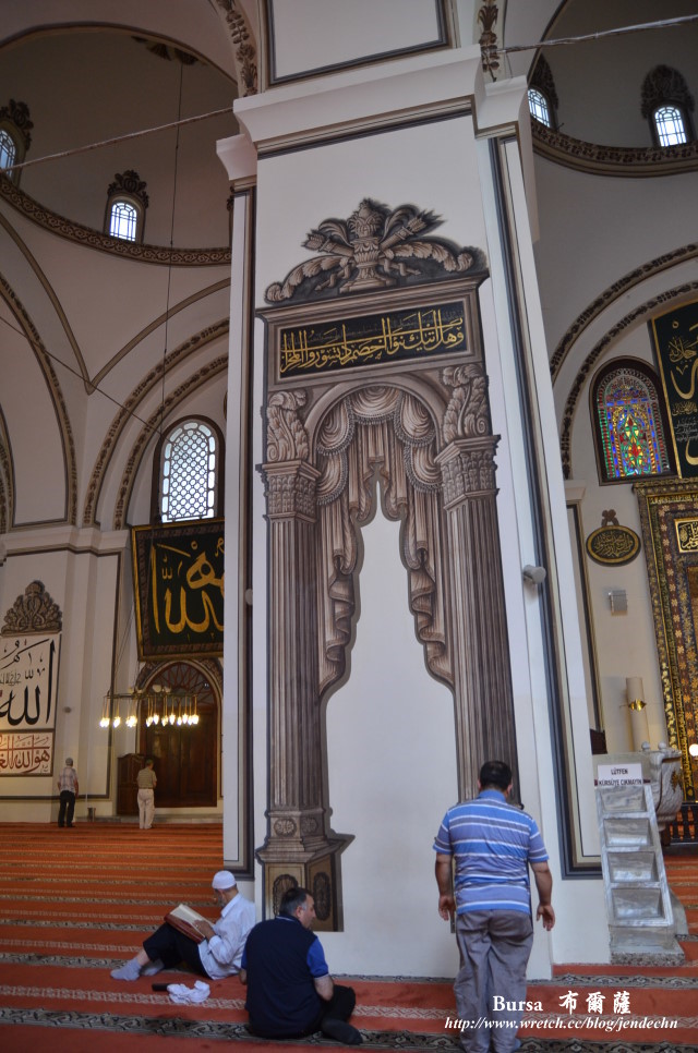 烏魯清真寺是第一座大小圓頂融合的清真寺,擁有20個圓屋頂極具特色,前後耗費40年時間才建造完成。內部牆面裝飾和伊斯坦堡藍色清真寺的華麗鮮豔不同,白色牆面描繪不少簡樸的伊斯蘭圖紋,顏色淡雅細緻,像極了中國的草書,雖然我們完全看不懂文字內容,但精湛的書法藝術,仍深深吸引我們的目光。寺內還有一座美麗的噴泉,潺潺水聲在室內迴響,在炎夏中注入了一股清涼,寺內還有一座精緻的講道堂也很值得看。