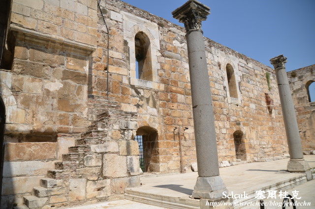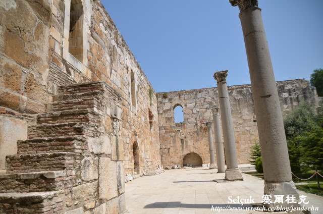 矗立在山坡上的聖約翰教堂,據傳基督12門徒之一的聖約翰晚年就是在此度過,裏面還有聖約翰之墓,但是當年的教堂早就因地震而摧毀,現在所看到的建築,都是後來重建的。在聖約翰教堂的北邊,還有一個6世紀拜占庭人建造的城堡,現在所看到壯觀的城堡外型,也是現代重新修復的。這個山坡的地勢比較高,視野很遼闊,可以清楚的俯瞰市區,塞爾柱克市區裏還留有一條拜占庭水道橋,這道東西向的水道橋頗為壯觀,現在古橋上端成了白鸛的家,上頭築滿了巢頗為有趣。