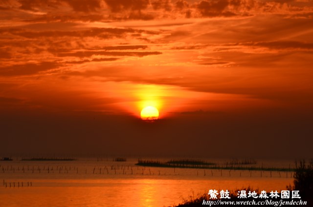 再次回到七號觀賞亭時,十分興奮的發現黑面琵鷺果然已經飛到岸邊覓食,距離近到肉眼就可以清楚的觀賞到它的一舉一動,就在忘我的專注於拍攝黑面琵鷺優雅的美麗身影時,突然瞄到天上的夕陽即將落入海面,趕緊抓起相機,快步衝上堤防,趕上落日的最後一刻。火紅的夕陽餘暉映在蚵棚上,美得讓人忘卻此刻還在鰲鼓濕地呢!