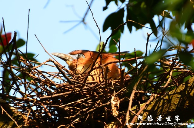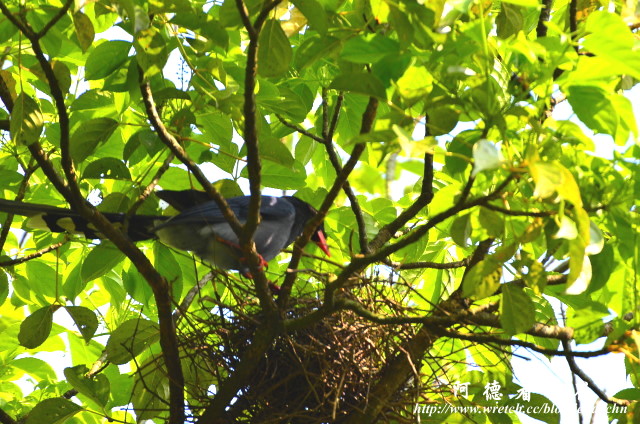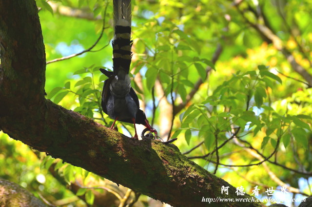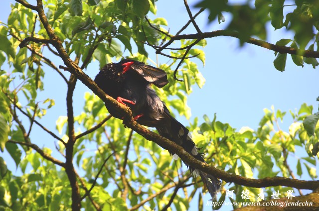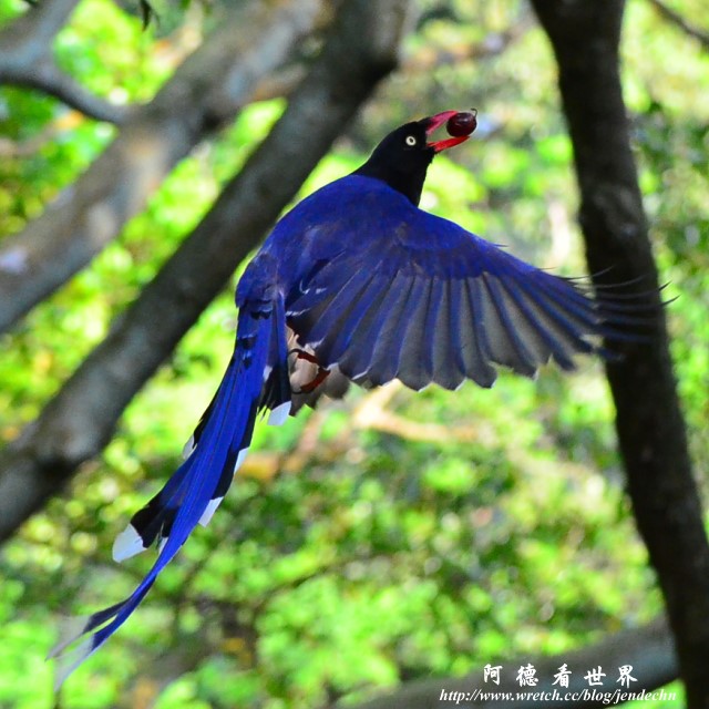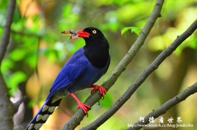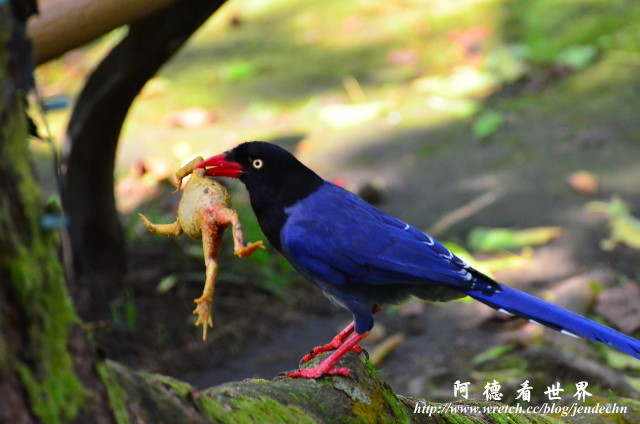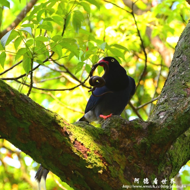 藍鵲常在溜冰場和湖山路間的林木築巢,到了那裏,樹下已守了不少人,抬頭搜尋,果然看到幾隻藍鵲在樹林中飛躍,在高枝上找到了一個藍鵲巢,還看不到雛鳥,看來正在孵蛋中。我們運氣不錯,到達時當好看到藍鵲正叼著一條蛇,過了一會,又抓來了一隻活蟾蜍,不要被藍鵲美麗的身影矇騙了,牠們攻擊力不容小覷!藍鵲生性喧噪兇悍,當雛巢受到威脅時,攻擊性很強,當天就看到幾隻藍鵲夾殺一隻松鼠的驚險鏡頭,還好這隻松鼠命大逃過了!
