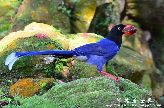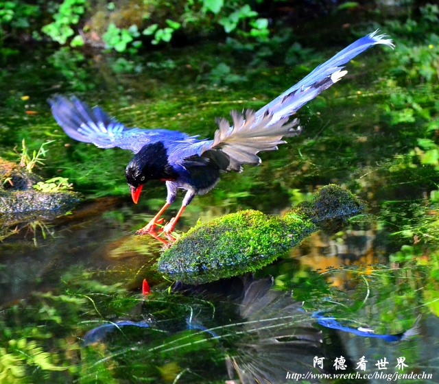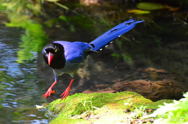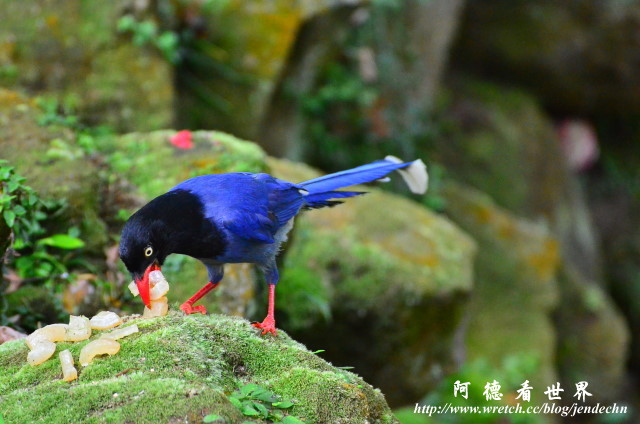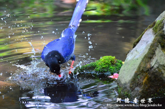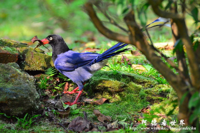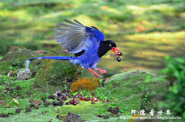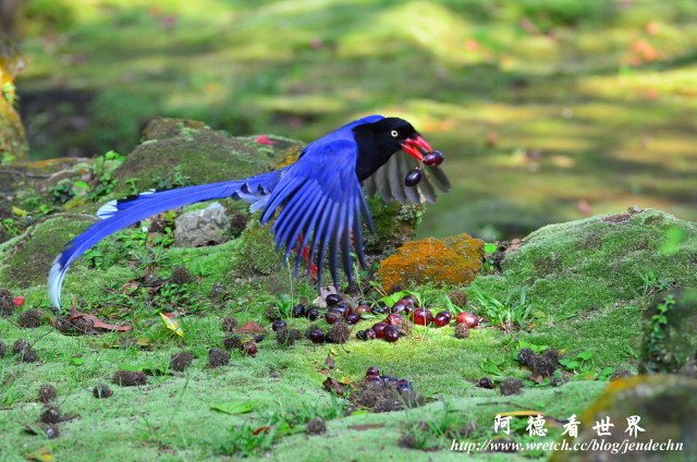前山公園的藍鵲大概是常接觸人群,比較不怕生,可以短距離的接近牠們,追蹤牠們的舉動很有趣,藍鵲喜歡戲水,偶而會飛到水池內洗澡,下水前還會照照水鏡,模樣真有趣!藍鵲是雜食性,除了吃小動物,也愛吃水果,有個住附近的阿伯拿來一串葡萄放在地上,藍鵲就這樣飛上飛下啄食葡萄,後來有人放了豬皮,牠們更貪心的一次叼走了好幾片,接下來的動作更逗趣,藍鵲會找個草叢或樹枝把戰利品隱藏,上面再蓋上樹葉雜草偽裝,這些有趣的舉動逗著眾人會心一笑!