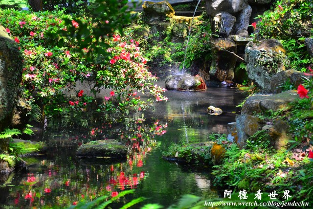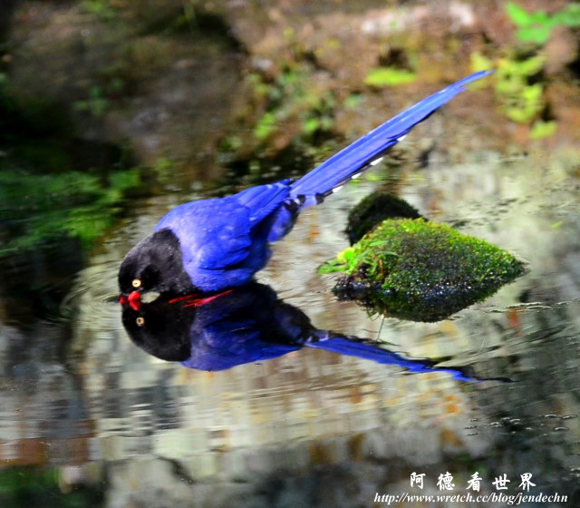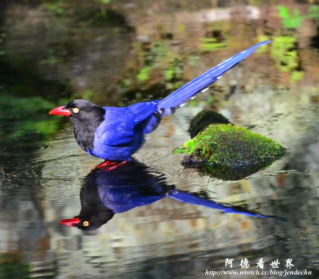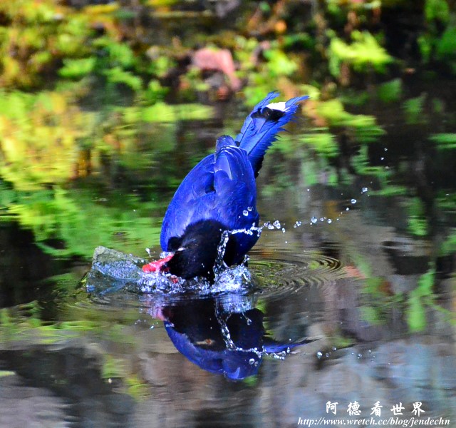 天候不穩定,上山的人也少,很快就在紗帽路找到了車位,陽光雖然露臉,溫度卻只有12度,高氣壓籠罩,空氣特別乾淨透明,天空澄藍清澈,樹木蓊鬱翠綠,荷花池倒影清晰可見,當日拍到的藍鵲羽翼也特別艷麗飽和!